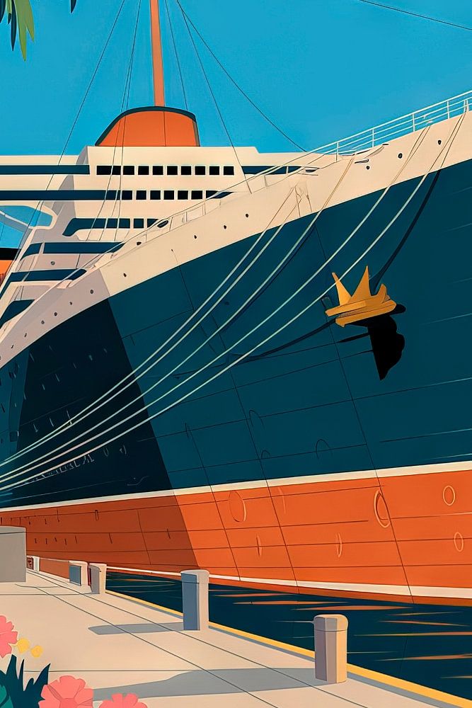 Een levendig eerbetoon aan de maritieme elegantie van Long Beach: de majestueuze scheepsromp, omringd door palmbomen en bloeiende bloemen, wekt reislust en dorst naar avontuur. De heldere kleuren en de illustratie in retrostijl brengen nostalgische charme in elke woonkamer. Ideaal om een ontspannen vakantiesfeer te creëren en reislust te stillen.