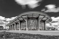 Het gebouw van de Jumbo in Meerstad Groningen is een ontwerp van Architectenbureau De Zwarte Hond uit Groningen. De foto is in zwart-wit en door een lange belichting zijn de wolken zichtbaar als vegen in de lucht. Dit maakt de foto anders dan anders.