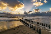 Welke betere plek dan het strand bestaat er om de herfstluchten te verwelkomen? Een laatste uitstoot van zonnestralen achter de wolken reflecteert op de onstuimige zee. Oktober 2018.