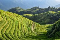 Groene hellingen vol rijstterrassen sieren de bergen nabij Longji, in het zuiden van China.