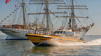 Loodstender Apollo passeert driemaster Statsraad Lehmkuml tijdens de Tall Ship Race 2018 finish bij Port of Harlingen.