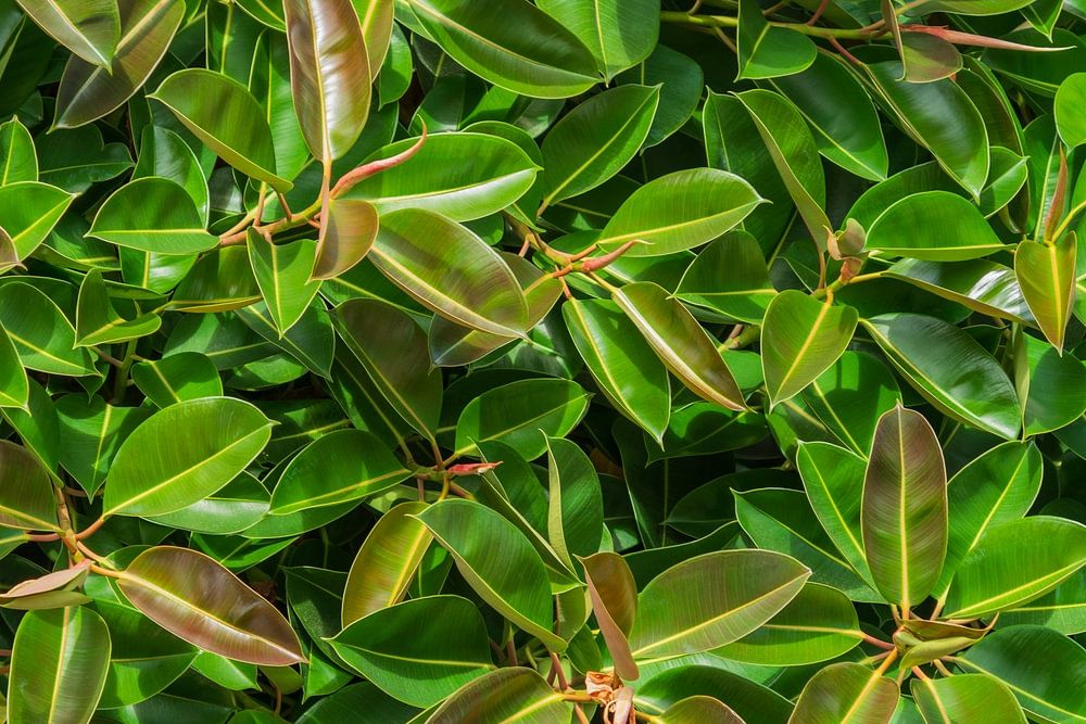 Beeldvullende close-up van de bladeren van een rubberboom in een zonnige omgeving