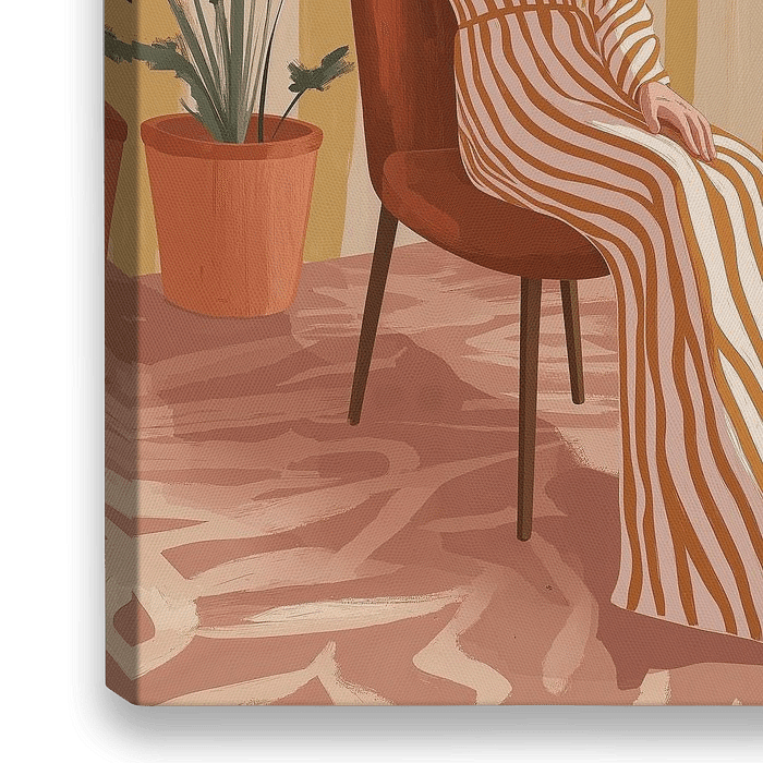 Een verstilde, contemplatieve scène waarin een eenzame figuur in een gestreept gewaad rustig zit, omringd door een huiselijke omgeving met plantengroei en een schilderij aan de gestreepte muur. Het beeld straalt een sfeer van kalmte, introspectie en rustige bezinning uit.