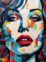 Een kleurrijke Pop art plaat van een dame met een indringende blik in een kleurrijk geheel.