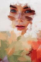 Modern portret. Een foto gecombineerd met een schildering waardoor er een abstract beeld ontstaat. Kleurrijk. Titel: "Look at me". Gebruikte kleuren: wit, bruin, rood, oranje, groen, lila, beige.