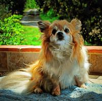 De vrouwelijke bruin-witte langharige chihuahua is verzorgd op een handdoek in de buitenlucht. Ze ziet er heel zacht, schoon en ontward uit en kijkt je recht aan. Ze wordt bewonderd, maar vraagt zich waarschijnlijk af wanneer ze weer op de grond wordt gezet en over de meubels mag schuren en in het vuil mag rollen om haar vacht weer te krijgen zoals ze het graag heeft. Elke hondenliefhebber kent die sory! Dit is een fotokunstbeeld gebaseerd op mijn foto van mijn hondje Holly, genaamd Looking at You Mom.