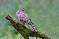 Jong vrouwtje Havik schichtig om zich heen kijkend op zoek naar voedsel op een open plek in een bos met de zacht groene kleuren van vegetatie in de achtergrond.
