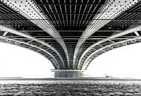 Zwaan zoekt een koel plekje om te rusten onder brug 'Pont de l'Universite' over the Rhone rivier, op een warme zomerdag in Lyon.