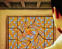 Een zwart gat verschijnt in het midden van een abstract, kubistisch schilderij, gadegeslagen door de waarnemer, in deze surrealistische popart-collage.