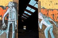 Graffiti op een deels open schuifdeur van een oude, verlaten loods op een industrieterrein in Groningen.
