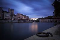 Een persoon kijkt naar de Saône rivier vanaf een oude voetbrug, Passerelle Saint-Vincent, in Lyon tijdens de zonsondergang.