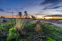 Zonsondergang in het Nationaal Park De Loonse en Drunense Duinen. Het groene mos, de bomen, de grassen en het zand maken dit gebied een geweldige plaats voor landschapsfotografie.