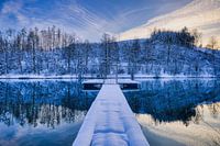 Het is winter. De steiger in de Aggertalsperre is bedekt met sneeuw. Het water is stil. De lucht wordt één op één weerspiegeld in het water.