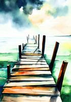 Een kalme aquarel toont een houten steiger die uitsteekt in zacht groenblauw water. De bruinoranje planken en donkere, verweerde palen worden gekenmerkt door hun zichtbare houten structuur. Lichte golven weerspiegelen de zachte, bewolkte lucht in blauwe en groene tinten. Het perspectief leidt direct van de steiger naar de verre horizon.…