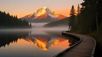 Het tafereel toont een rustige houten brug die zachtjes over een stil meer leidt, wat het beeld een tijdloze, bijna meditatieve kwaliteit geeft. De planken zijn vergrijsd door het weer, hun nerven en kleine scheuren vertellen van vele seizoenen; de reling werpt fijne, grafische schaduwen op het oppervlak terwijl de kijker over de brug…