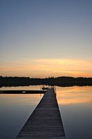 Loopbrug, bij zonsopgang, reikend in een Zweeds meer. Stilleven in Scandinavische natuur.