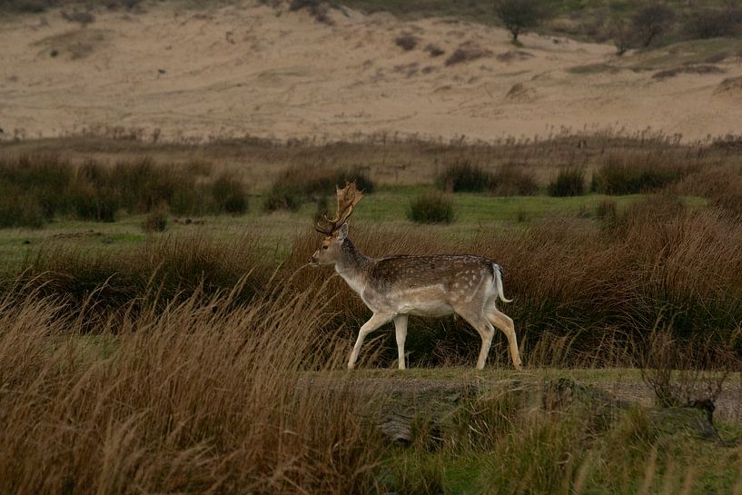 Een prachtige foto van een hert dat op zijn gemakje rondloopt in de Amsterdamse waterleiding duinen.
