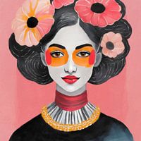 Een portret van een vrouw met uitgesproken make-up, dito kledij en met bloemen in het opgestoken haar.