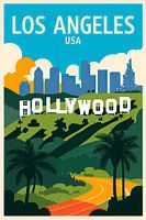 Felle zonneschijn kust de heuvels van Los Angeles, terwijl de beroemde Hollywood-letters in majestueuze pracht oplichten. Gestileerde skylines rijzen op in de achtergrond, omlijst door weelderig groen en palmbomen, en beloven de droom van glamour en avontuur. Een ontspannen straat baant zich een weg door dit iconische decor - een echte erfenis van de filmstad.