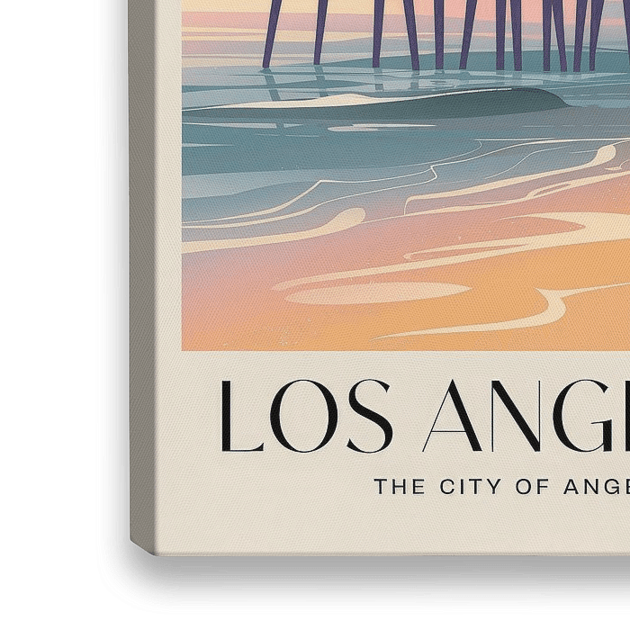 Zachte pastelkleuren omhullen een schilderachtige achtergrond van het fascinerende Los Angeles. De zachte golven weerspiegelen de zonsondergang, terwijl het iconische reuzenrad majestueus op de pier staat. Dit kunstwerk brengt het gevoel van vrijheid en avontuur naar je woonkamer, perfect voor de muur die je uitnodigt om te dromen.