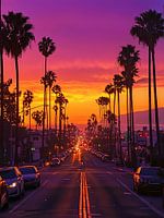 Een sfeervolle poster van Los Angeles bij zonsondergang, met hoge palmbomen die elegant afsteken tegen een paars-oranje hemel. Warme straatverlichting gloeit zacht tussen de silhouetten. De stad straalt een dromerige, filmische sfeer uit — rust en energie tegelijk. Een perfecte mix van natuur, licht en urban charme.
