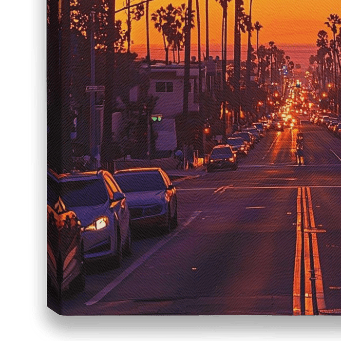 Een sfeervolle poster van Los Angeles bij zonsondergang, met hoge palmbomen die elegant afsteken tegen een paars-oranje hemel. Warme straatverlichting gloeit zacht tussen de silhouetten. De stad straalt een dromerige, filmische sfeer uit — rust en energie tegelijk. Een perfecte mix van natuur, licht en urban charme.