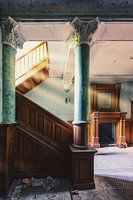 Urban Exploration is de verkenning van lang verlaten plaatsen en gebouwen en wil de schoonheid van deze vervallen architectuur laten zien. Verlaten herenhuis met pittoreske trap in de zon.