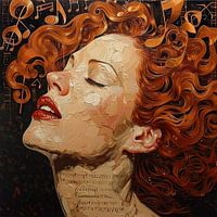 Een roodharige vrouw staat centraal in het schilderij, haar hoofd half achterover, haar ogen gesloten in extase terwijl ze volledig opgaat in de muziek die haar omringt.