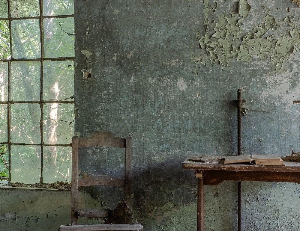 Een leuk tafereeltje met oude spulletjes in een prachtig verlaten woonhuis met atelier. Dit enorme pand zit vol oude, karakteristieke elementen en is overgeleverd aan verval en overname door de natuur. Het ietwat duistere en rauwe beeld roept een gevoel van nostalgie op. Het prikkelt de fantasie. Wie woonde hier? Wat deed deze persoon met al deze ruimte? Hoe zag het eruit toen het nog bewoond was? En waarom ligt al deze pracht en praal er nu verlaten bij?