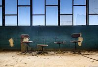 Een verlaten textielfabriek met wat overgebleven stoeltjes