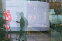 Onze eigen digitale wereld is toch belangrijker dan de anonieme digitale omgeving. Deze foto is genomen door een reflecterend glazen scherm. Ondanks de om aandacht schreeuwende aanwezigheid van de rode figuur op het scherm gaan de aandacht van deze reiziger toch uit naar zijn eigen beeldscherm.