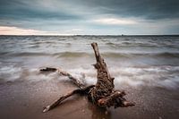 Oude boom die verdwaald is geraakt in een landschap die afbrokkelt aan de kustlijn die ooit vast stond en diep geworteld.