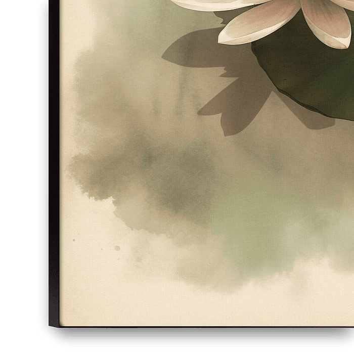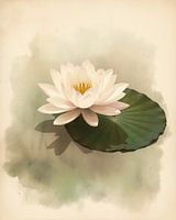 In deze illustratie zien we een witte lotus met een zachtgele bloemkern, rustend op een groene waterlelieblad. Het geheel is geplaatst tegen een aquarelachtige achtergrond van beige- en groentinten die doet denken aan stilstaand water bij zonsopgang. De lotus is gedetailleerd weergegeven, met meerdere lagen bloemblaadjes en subtiele…