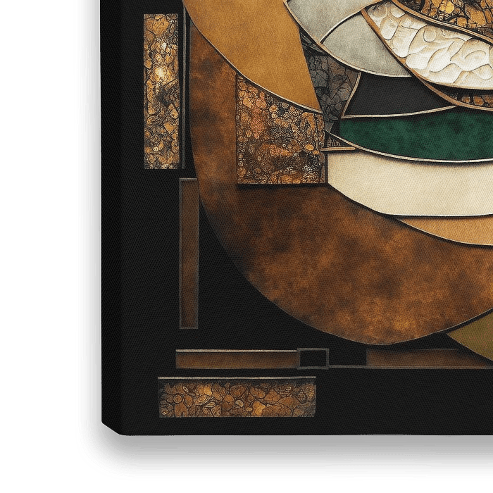 Mixed media kunst in diverse lagen met roest textuur,olieverf en papier in aarde tinten met goud accent.