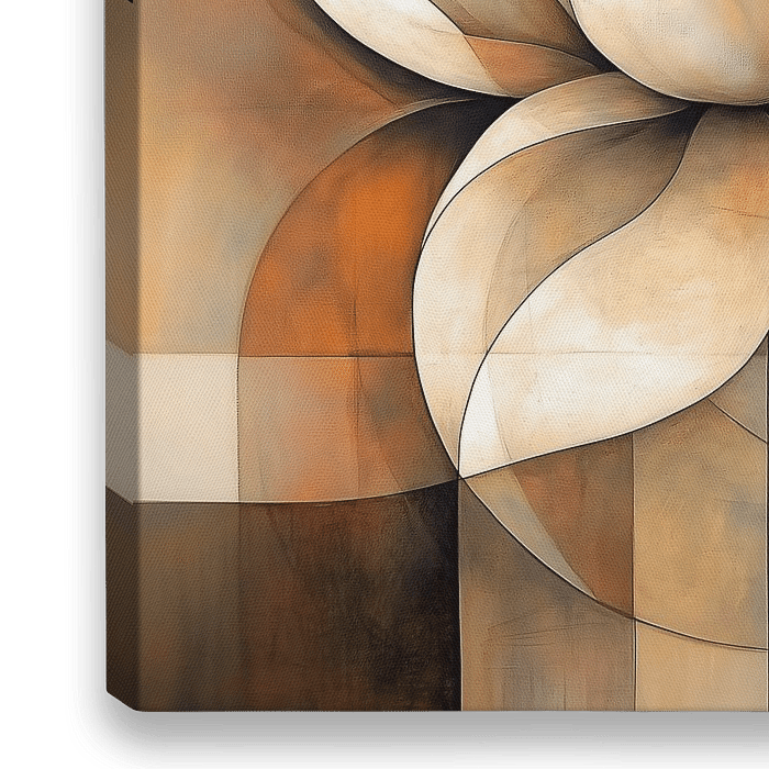 Abstracte lotusbloem in warme aardetinten met kubistische en geometrische elementen op een grof canvas doek textuur.