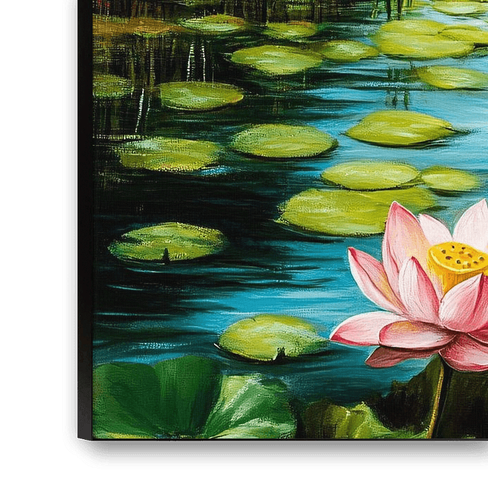 Dit schilderij toont een serene waterkant bezaaid met prachtige lotusbloemen, omlijst door levendig groen en een rustgevende waterpartij. De kleurrijke bloemblaadjes en het kalme water maken dit kunstwerk perfect voor het creëren van een ontspannen sfeer in je huis of kantoor. Het gedetailleerde ontwerp straalt rust uit en biedt een warme, natuurlijke uitstraling die bij elke interieurstijl past. Laat je inspireren door de harmonie van natuur en kunst!