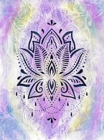 De achtergrond van deze aquarel heb ik gemaakt in veel zachte tinten met behulp van de folietechniek. Ik schetste het lotusbloesempatroon en benadrukte het met een indigoblauw penseel. Een meditatief en spiritueel motief.