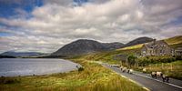 Schapen lopen over de weg bij Lough Inagh in Connemara National Park in county Galway in Ierland