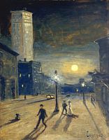 zicht op de stad New York in Amerika in het donker. De maan schijnt en verlicht de straat met de straatverlichting en de wandelaars.