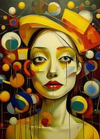 Dit kleurrijke kunstwerk combineert abstracte geometrische vormen met een portret van een vrouw. De heldere kleuren, scherpe lijnen, en speelse patronen suggereren een samenspel van emotie en rationaliteit. Het geheel straalt een moderne, kubistische stijl uit met een vleugje surrealistische expressie.