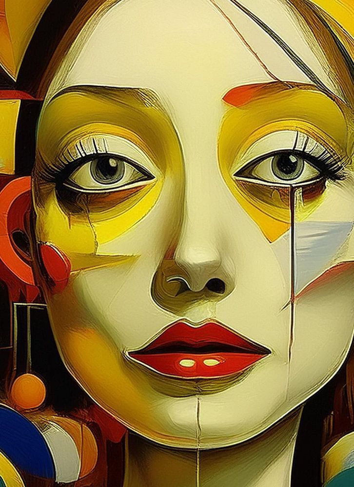 Dit kleurrijke kunstwerk combineert abstracte geometrische vormen met een portret van een vrouw. De heldere kleuren, scherpe lijnen, en speelse patronen suggereren een samenspel van emotie en rationaliteit. Het geheel straalt een moderne, kubistische stijl uit met een vleugje surrealistische expressie.