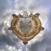Prachtige 360 graden panorama opname als planeet van museum het Louvre in Parijs, Frankrijk, met de bekende piramide op een bewolkte lentedag