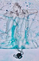 Een figuratief werk van bruin draad op een transparante ondergrond omhuld door blauw water.