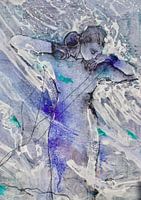 Een figuratief blauw schilderij waarbij gebruik is gemaakt van verschillende technieken.
