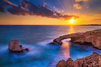 Zonsondergang in de MIddellandse Zee bij de "Love Bridge" rots-boog nabij de stad Aya Napa in oostelijk Cyprus.