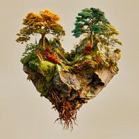 Een hartvormig landschap met bomen en vegetatie, tegen een geïsoleerde achtergrond wat een sterk contrast creëert dat de unieke vorm benadrukt. De scène is weergegeven met gedetailleerd gebladerte en ruig terrein. Een gevoel van rust omhult het, alsof je op het oppervlak staat en uitkijkt over de schoonheid van de natuur. Dit kunstwerk…