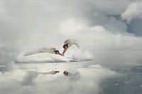 Zwanen, mythische dieren, ze staan symbool voor trouw tot de dood hen scheidt. Een paartje zwanen met volle aandacht voor elkaar badend op een open plek in het inmiddels licht bevroren water omgeven door nevel en laaghangende bewolking. Een dromerige plek voor een nooit eindigend verhaal van liefde.