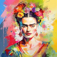 Frida, bekend om haar liefde voor bloemen, wordt hier op een bijzondere manier afgebeeld. Dit werk valt op door het gebruik van floral impressionisme, waarbij de bloemen in haar haar een buitengewone levendigheid en beweging uitstralen.