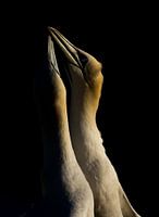 Twee Jan van Genten begroeten elkaar, gefotografeerd tijdens de zonsondergang. (Helgoland, Duitsland)