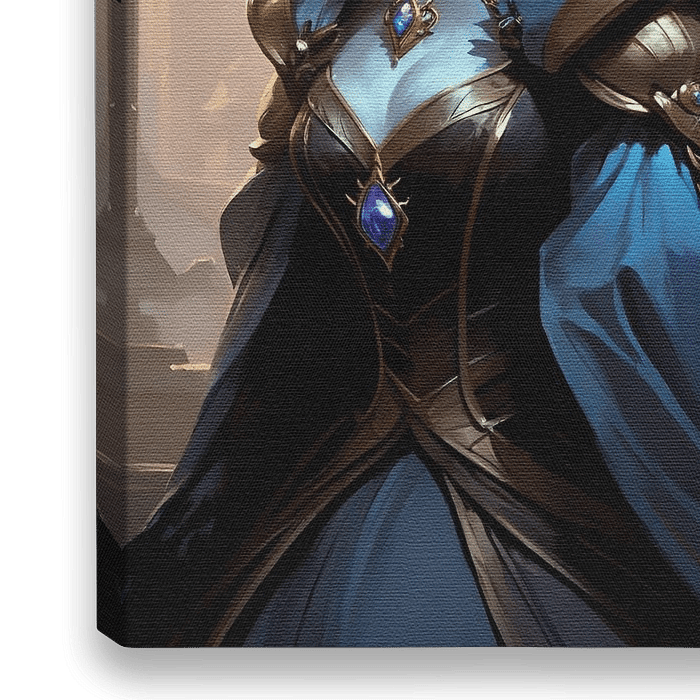 De kat po(e)seert als een ware koningin, gekleed in een prachtige glanzende blauw met gouden jurk, compleet met cape en ketting met edelstenen. Op haar hoofd een gouden kroontje met edelstenen.
